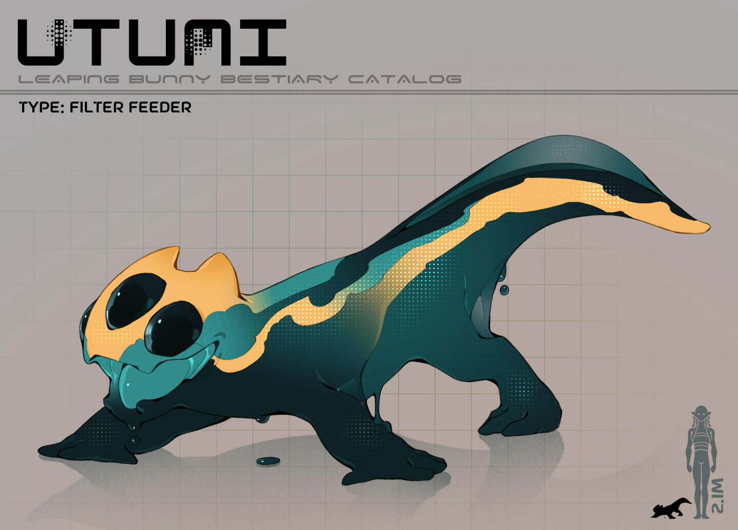 Utumi are creatures that roam within the water caverns of Atlussen II. Their skin emits minimal light, which they use to find mates with a little dance. Slick and slimy, they're experts at moving through tight spaces in contorting ways. They are filter feeders, feeding on the minerals and nutrients that exist in muddy soil and sand. A species found to live between the bridges of earth and water.