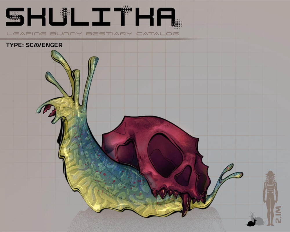 Skulitkas are carnivorous snails that trudge along the floors and trees of Xuxia, looking for their new homes in the carcasses of dead animals and, when big enough, the skulls of fallen tourists. They use their pincers to loosen any left over meat from the bones, and then releases an acid that softens the flesh further, allowing the Skulitka to eat the flesh off the bones. They are normally found near bodies of water and near the bases of carnivorous plants, ranging from a blue-green to a red-purple ombre.