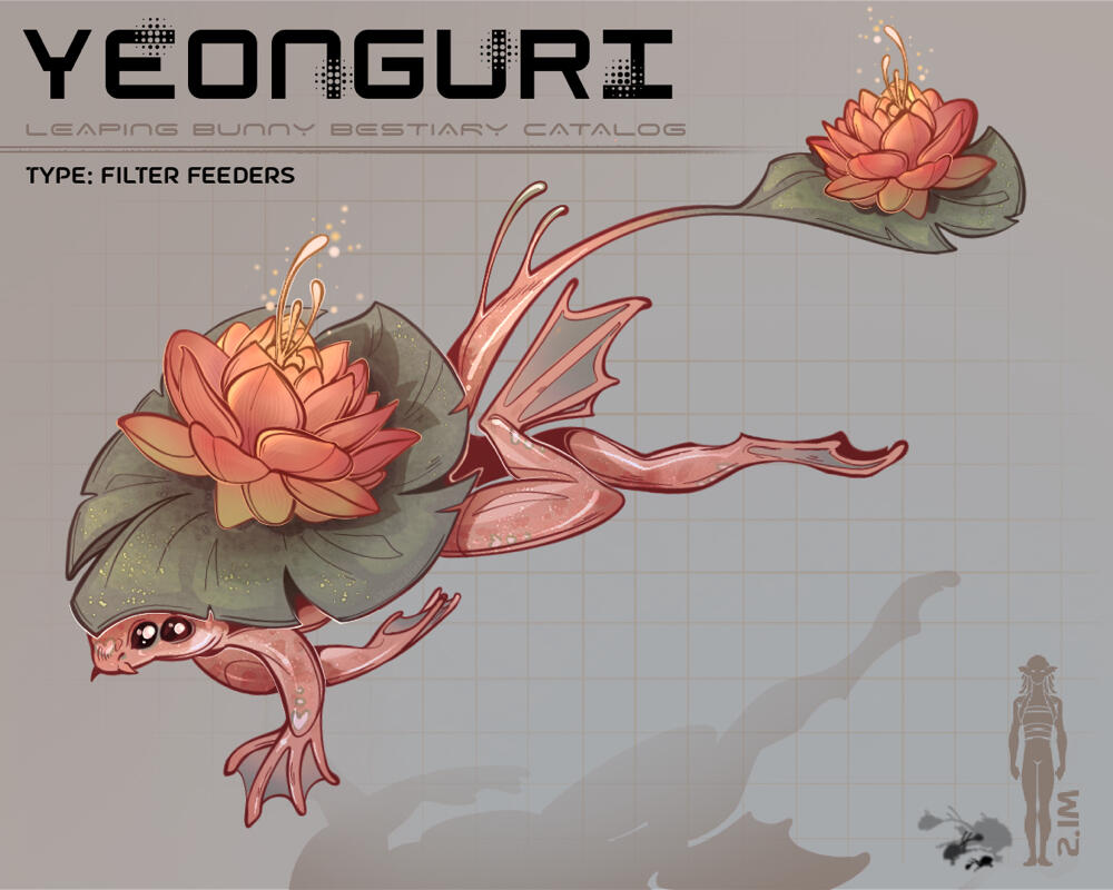 Yeon Guri are omnivorous frogs that reside in the few bodies of water around Xuxia, cleverly hiding themselves from predators by evolving to have a lilypad and lotus grow on their backs. They eat the algae, micro plants, and insects around their pond, keeping their respective populations in check. However with one insect, the Berbulu, they are amiable. The Berbulu pollinate their lotus flowers and allow for the micro plant population within the pond to sustain itself. With bigger Yeon Guri's its not uncommon to see a Berbulu taking a nap in their lotus flowers.