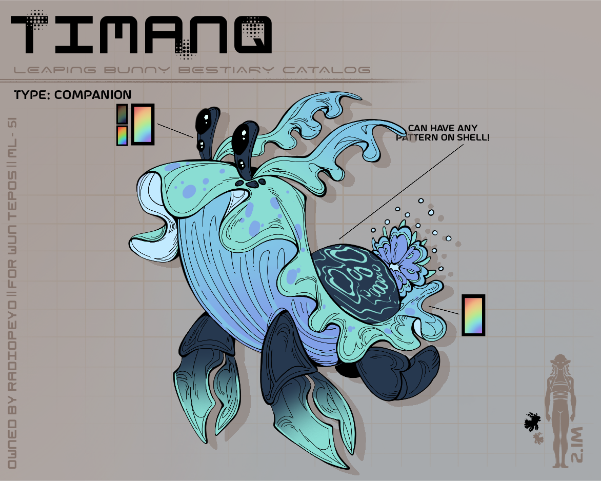 Timanq are small but mighty ocean creatures found in all the reefs and open ocean of Ono. With their small bodies and ornate patterned shells, timanq often explore the varied Onoain landscapes for shells, rocks and trinkets to add to their stash. Preffering to keep said stash buried in sandy places, or kept with their companion.These playful creatures are known for their affectionate nature with Onoains and other ocean animals alike, often gifting their Onoain companions with shells and rocks, inviting the Onoain to build a stash of their choosing with the timanq. Their shells, a canvas of vibrant colors and intricate patterns are developed as they grow, but solidify when they reach maturity. The timanq's playful spirit is evident in its love for racing, something they often plead with their companion to do with light bumps into them or tugging at their companion's clothing.