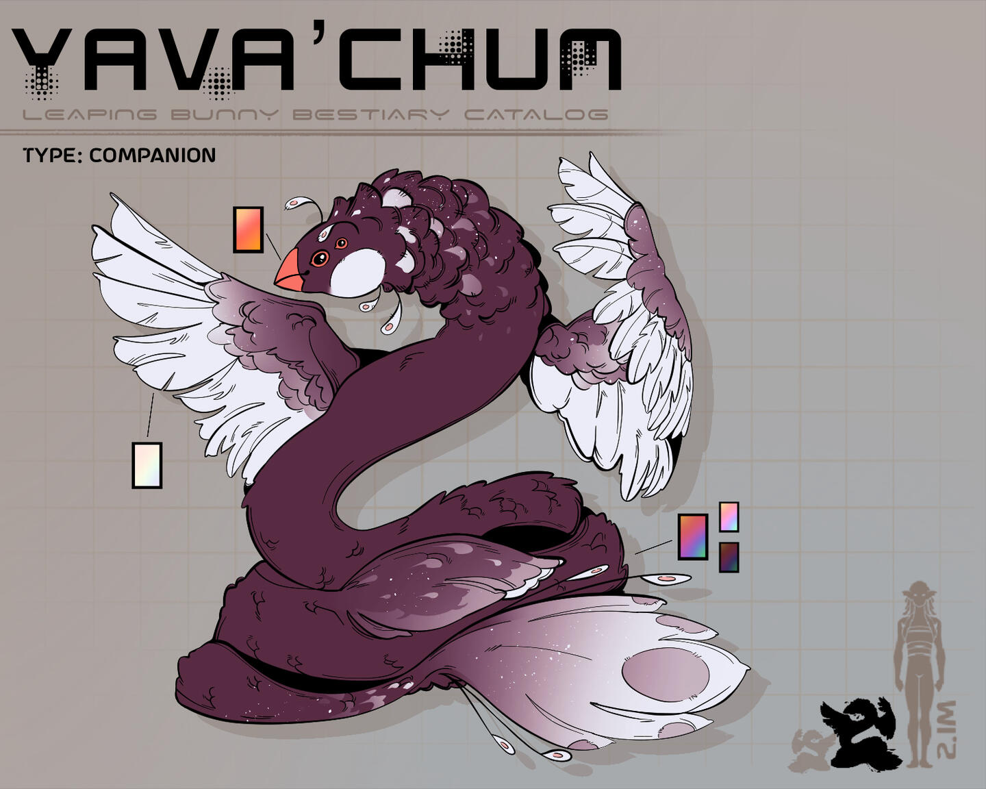 Yava'chums are the native serpent-avian species of Xuxia, often making their homes in holes in Xuxian trees. With their keen eyes and lightning-fast reflexes, they effortlessly snatch insects from the air, adding them to their diet of fruits, seeds and nectar. These social creatures form bonds with Xuxians, often curling around their companions for warmth and comfort, but yava'chums are skilled hunters, and are a beloved companion thanks to their skill of fending off insects and other critters. Some even develop a knack for mimicry, often heard to mimic musical tunes, or sounds often in their environment.Yava'chum companion's are advised to help their serpent with feather maintenance, both to gain their trust more and to aid them with pin feathers and shedding seasons. A yava'chums feather pattern and coloration is also known to be as unique as a finger print, with colours ranging the entire colour spectrum, with the two main features that differentiates them being their light cheek fluff, and their warm toned beak colours.