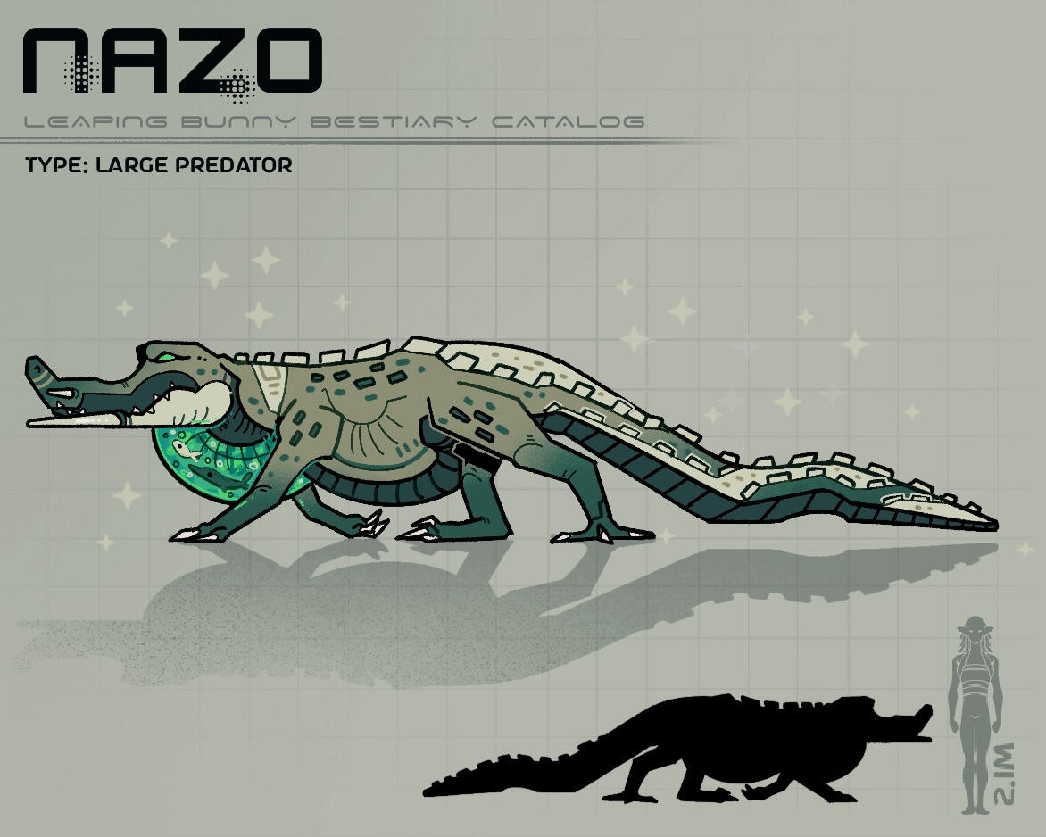 Once a very important large predator from the rivers of the mainland, this caiman-like species was known for their huge statures and frog-like throats, where they stored large amounts of algae they use to lure in prey. Their croaking was often known to be a threat display, while the fish inside their throats lived and fed unaware of their upcoming fate. It is known Nazo are carnivores but are not lethal to anything bigger than them. While their main diet is the fish in the rivers they swim in, they’re not above drowning land creatures inside their throats for the sake of a quick meal. When their throats are full enough, they will not open their mouth at all, and will instead slowly start digesting whatever is inside.Commonly placed in the Western and Central regions of the planet, some rangers of preservation domes still house them inside their rivers for population control of common prey species.
