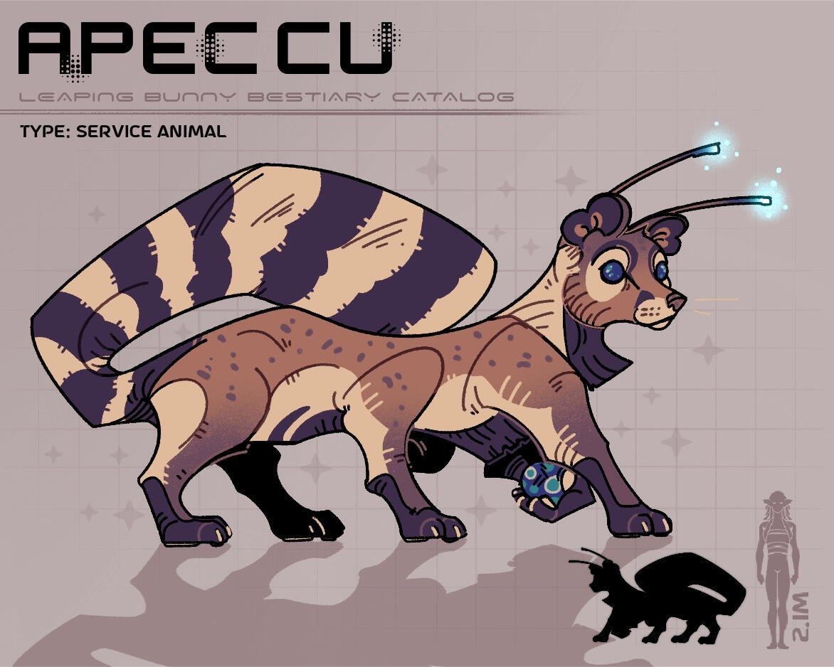 Apeccu are a crossbreed species between the Large Apec and the Cuttellos, two animals commonly used in training in the old eras of Alphean kind. This mix was made to be able to ensure a companion would be plausible in the conditions of both Atlussen II and Xuxia and have successfully been domesticated since then. Now, Apeccu are commonly used as service animals for Alpheans who suffered from chronic injuries and require assistance in their day to day. They are incredibly athletic, natural climbers and overall very receptive to any pain signal given to them by their companion at the time.