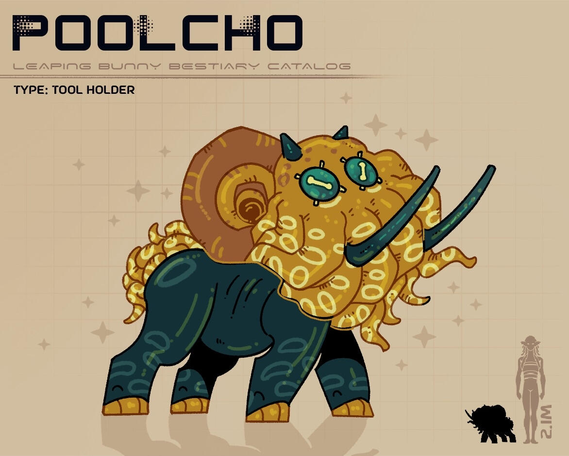 Poolcho are small friends from the upper pressure levels of Ono that have been domesticated to be simple companions in everyday life. They have a fascination with holding things and, when bored enough, will shove them into their mouths. While their wild counterpart can grow to be 10 times bigger, the domesticated version doesn't get bigger than half the height of their Alphean. People still don’t know what made this subspecies of Poolcho so small, but it seems to have helped their health in the long run.Poolcho can come with a variety of colorful combos on their body, alongside different markings. While some Alpheans file their tusks down to make it easier to navigate, the common Poolcho has prominent tusks that poke into things as they meander around.
