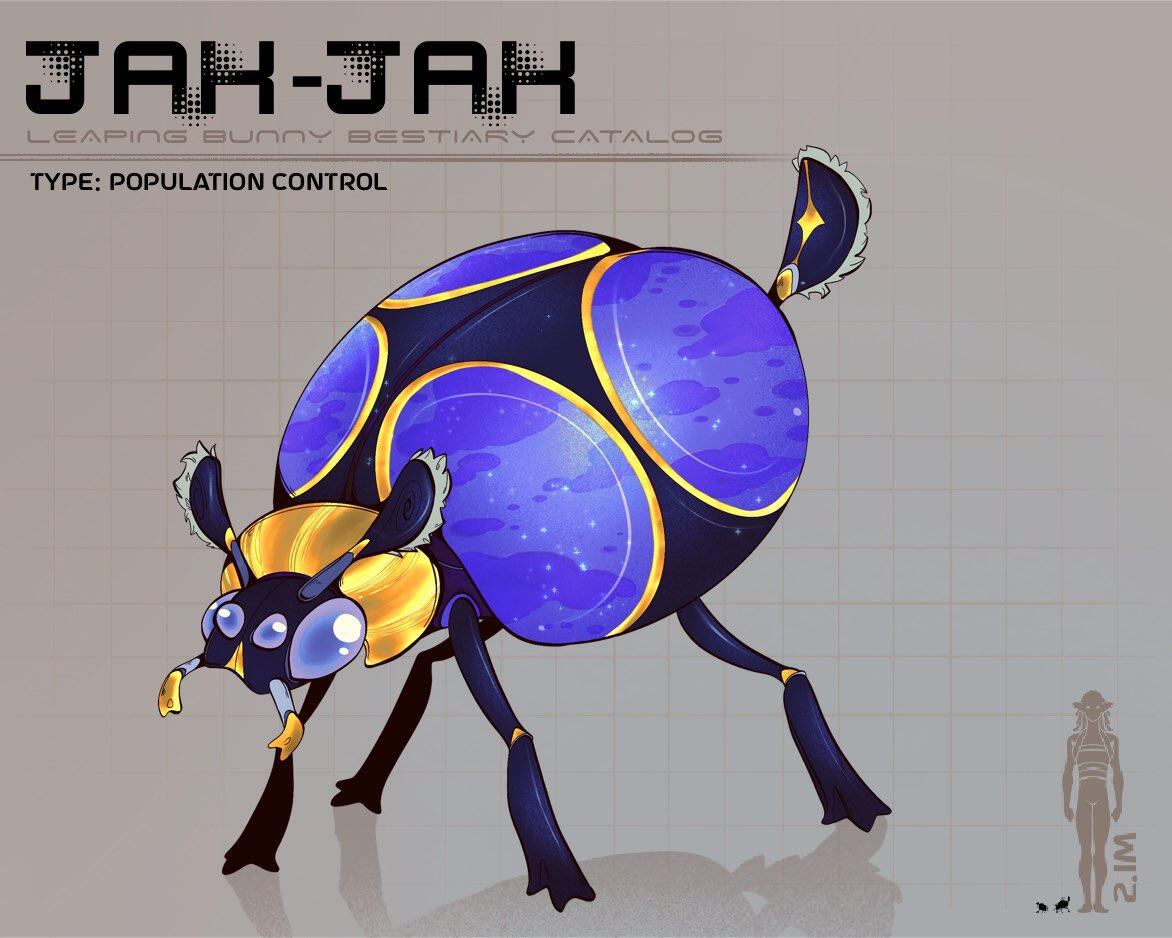 Jak-Jaks are beetle-like bugs that originally kept Alph'Ea's farmland free of pests that ate the harvest of farmers. Their vibrant colors allow them to blend in with flowers during the day, and the sky at night. Xuxian farmers have taken a liking to them and have been using them on their own crops to keep harvests plentiful. They are mostly found in flower fields and in forests all over current reservoirs. Their fuzzy ears and tail also help them pollinate the fields they reside in.