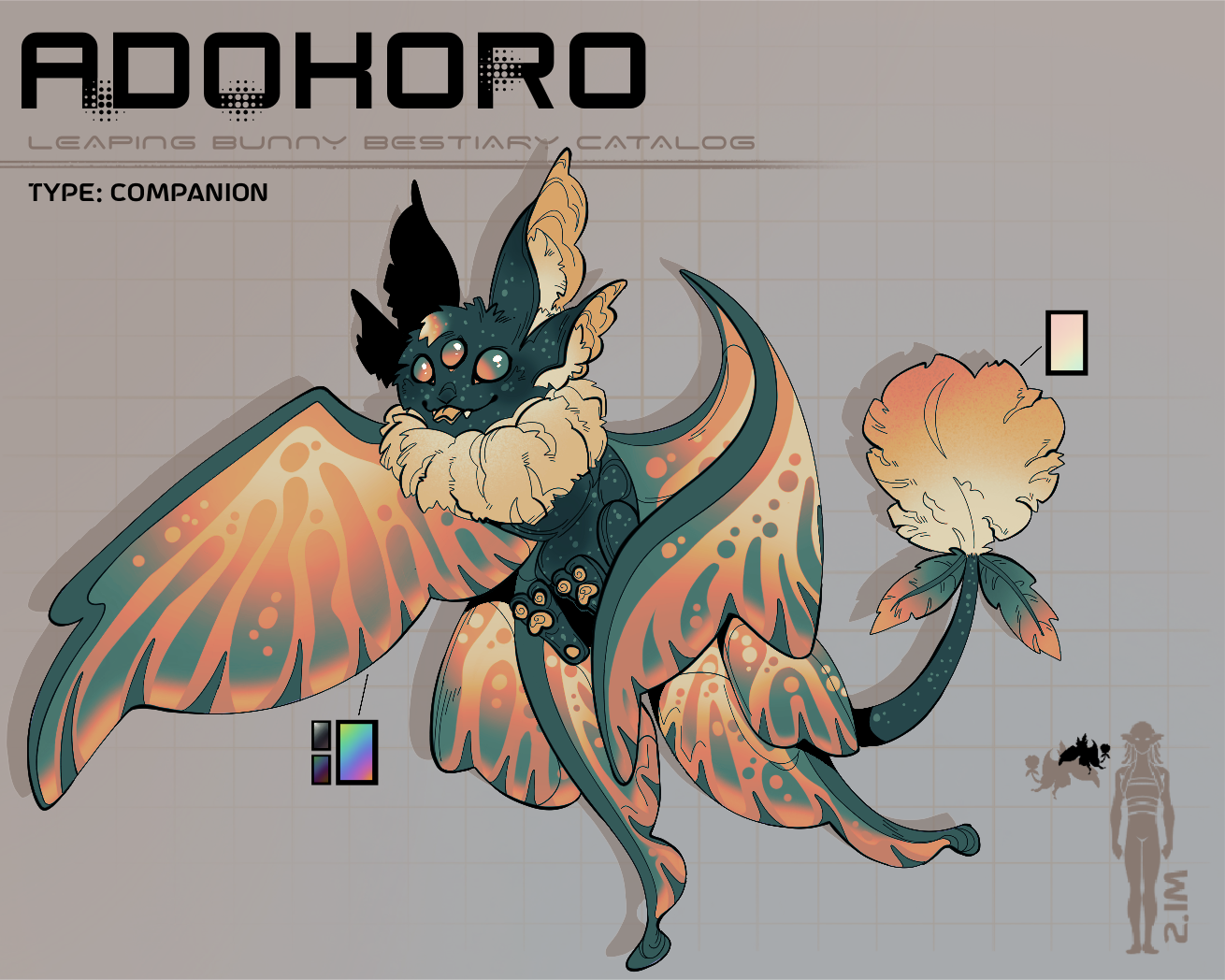 Adokoro are creatures native to the labyrinthine caves of Atlussen II. With their three sets of wings, they glide effortlessly through the cavernous tunnels, their sensitive antennae and keen hearing guiding their way. Relying on vibrations, air currents, and the presence of companions, Adokoro navigate their intricate habitat with remarkable precision. Their diet is a blend of minerals and fungi, which they obtain using their sharp teeth and sensitive noses.Their small but powerful legs allow them to climb and hop across rocky terrain, reaching hidden crevices and inaccessible areas. Known for their vibrant and bioluminescent wings, Adokoro almost mimicking the precious stones found within Atlussen II's caverns as camouflage. Friendly by nature, Adokoro often approach miners and visitors, and adore hanging and perching on their companion during travel.
