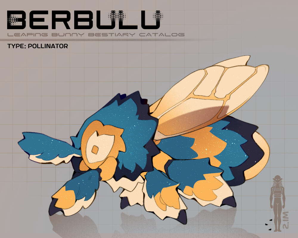 Berbulu are small pollinator insects that swarm in small groups a reasonable distance from their hive. They are gentle and harmless creatures whose only goal is to gather nectar to survive each passing season. They have a distinctive blue and yellow coat with a glowing bottom which they use to communicate with their fellow hivemates. These insects are under the wildlife protection and those found damaging their hives will be fined.