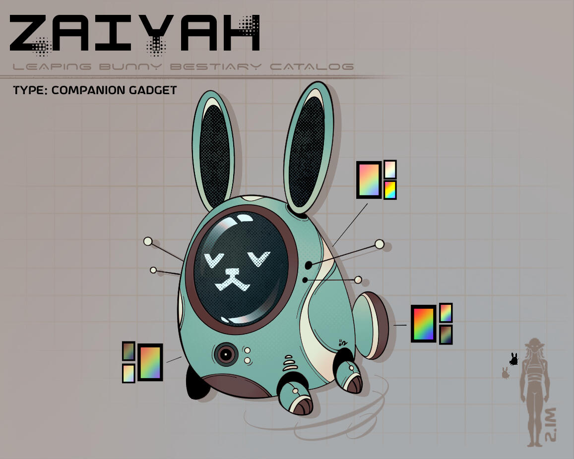 The mechanical sweetheart of Alph'ea, the Zaiyah is a gadget seen throughout the Prime System, but is mainly seen on the main planet Alph'Ea! Thanks to strict regulations in Alph'ea with live animals and the existence of L.E.As, the Zaiyah is seen more as an emotional support item, rather than a pet. But that doesn't stop Alph'eans from connecting with them emotionally, especially with the little gadget's changing emoticons.This floating buddy is customizable to any colour and metal pattern the Alphean wishes! While once again, this little bunny is not a LEA bot, this adorable gadget can play music through their speaker ears, project holograms and videos from their camera, and can store any small trinkets your Alphean has! These companions also have a slgith magnetism to them, so owners often create custom magnets to stick on their Zaiyah.